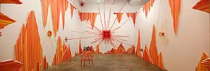 In the 2000s, Cooper expanded her practice to include furniture-like sculptures and full installations that increasingly colonized their exhibition spaces.[40][41][42][43] Speedway (2000–3) was a freestanding, De Stijl-styled foamcore structure, consisting on one side of a cutaway that Nancy Princenthal described as "a Las Vegas marquee of pulsing concentric and parallel lines, punctuated by seedily alluring little niches,"[44] and on the other, a dollhouse-like grid of cubbyholes, suggesting a Mondrian/Donald Judd-influenced "mini-museum."[7][34] The mutating, increasingly elaborate installation Orange Alert UK (2003-8) employed taut linear arrangements of vivid reds, oranges and yellows, initially inspired by the color-coded, post-9/11 terrorist alert system, which formed cardiograph-like wall patterns and radiated from a central, spider-like form.[24][30][1][45]