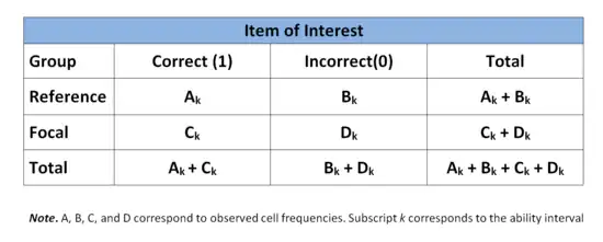 A common procedure for detecting DIF is the Mantel-Haenszel (MH) approach.[12] The MH procedure is a chi-squared contingency table based approach which examines differences between the reference and focal groups on all items of the test, one by one.[13] The ability continuum, defined by total test scores, is divided into k intervals which then serves as the basis for matching members of both groups.[14] A 2 x 2 contingency table is used at each interval of k comparing both groups on an individual item. The rows of the contingency table correspond to group membership (reference or focal) while the columns correspond to correct or incorrect responses. The following table presents the general form for a single item at the kth ability interval.