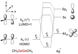 The quarlitative molecular orbital diagram of the interaction between Ar1GeGeAr1 and Ag+.