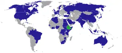 - ↑ Ethiopia does not recognize the unilaterally-declared independence of Somaliland, and has formal diplomatic relations with Somalia. Nonetheless, Ethiopia has a consulate-general in Hargeisa, the capital of Somaliland.