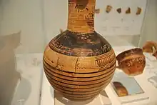 ![]() Dipylon oenochoe (left), on display in the National Archaeological Museum, Athens. The inscription is scratched into the dark band around the shoulder of the vase. | |