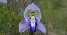 Plants are 200–250 mm (7.9–9.8 in) tall, growing from a tuber with a length of about 30 mm (1.2 in) and a diameter of about 10 mm (0.39 in). About 10 narrow, rigid leaves, about half as tall as the plant, grow from a basal rosette. The base of the plant is often surrounded by a sheath of old leaf fibers.[1] This species flowers in October and November, producing an inflorescence of 1-7 sweetly scented flowers. Each flower has a blue hood and side wings, with a dark purple lip below. Yellow-green petals are found at the back of the hood. [2] While the flowers look similar to those of Disa graminifolia, they differ in having an upcurved lip margin and a conical spur. They also flower at different times of the year. [3] While there is generally very little variation between plants, some white flowers have been observed. This has been suggested to be a recessive condition.[1]