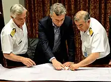 On the same day, Argentine president Mauricio Macri moved to the official residence at Chapadmalal, near Mar del Plata, in order to follow the search and rescue operation more closely.[13][14] The Argentine Armed Forces set up a centre of operations at the naval base in Mar del Plata, with family members of the submariners also present at the base. The Argentine Navy brought in a team of mental health professionals to aid the families; a team to keep them updated on the search and rescue effort had also been set up.[15] Also on 17 November, the International Charter 'Space and Major Disasters' was activated by the Secretaría Nacional de Protección Civil de Argentina, thus providing for humanitarian satellite coverage.[16]