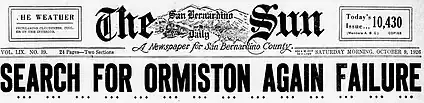 As McPherson's accused lover who allegedly assisted in the kidnapping fraud, Ormiston was a prominent defendant in the 1926 grand jury inquiry. He had been McPherson's radio operator and was crucial in getting her programs on the air. He was described as about 5 feet 11 inches (180 cm) tall, bald, slender, and good-natured with a wonderful disposition.[98] He also had a distinctive limp that frequently identified him more than any other feature. During the time of McPherson's disappearance, newspapers freely speculated about him and the Los Angeles DA office initiated various manhunts accompanied by front-page headlines, searching for the elusive radioman.[99] Though the Los Angeles prosecution and two city newspapers spent lavishly to romantically connect McPherson with Ormiston, no conclusive evidence that they were lovers could be uncovered.[100] To some law enforcement officials outside of Los Angeles, the pursuit of Ormiston was done for publicity.[101][102][103]