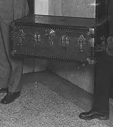 On October 29, after the defense rested its case, District Attorney Asa Keyes announced the September discovery of a large blue steamer trunk allegedly owned by Ormiston and thought to be full of McPherson's clothing. On November 8, 1926, a Kansas City private detective, described as a "go between" for Ormiston, transmitting him money and messages, stated the trunk was a "fake."[118] Ormiston, who was still eluding authorities to avoid being pressured to reveal Miss X's true name, said on November 19 "the trunk is bunk."[119] Some of the clothing was found to be the wrong size for McPherson.[120] The trunk became an object of jokes, in reference to anything unwanted, unknown, or lost as being laid away in that big blue trunk.
