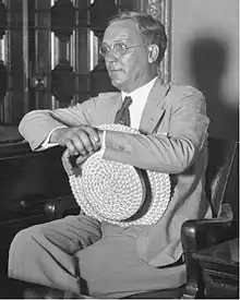 In December, Ormiston was found by newsmen, living quietly in Harrisburg, Pennsylvania. Papers described him being taken without resistance by police while sitting at a typewriter.[121] A Harrisburg detective characterized the affair as a "publicity stunt," but declined to elaborate. Among Ormiston's personal effects were five diplomas from five radio schools and letters implying he had a wife in Brazil.[101] He was escorted to Chicago, Illinois with intent to be transported to Los Angeles. Asa Keyes said he would “do everything in his power” to extradite Ormiston. However, he did not stop in Chicago to pick him up though he traveled near there on his way to and from Washington, D.C. The Chicago police chief denounced Keyes for "yelling to high heaven for his apprehension" but when the fugitive Ormiston was "within reach," Keyes called Ormiston of minimal importance.[103][122] The Chicago police chief lacked proper documents for further action, and to the annoyance of Los Angeles officials, Ormiston was released. When the warrant was finally obtained, Chicago police were ready to transport their expected prisoner, Ormiston, to Los Angeles [123] In the meantime, Ormiston appeared in Los Angeles surrounded by newsmen and was greeted by the entire prosecution staff. Affably, amidst the flashbulbs of photographers, Ormiston accepted his served warrant. His bond was set at $2,500.[124]