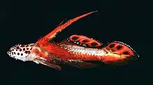 Discordipinna griessingeri is a small, brightly colored, marine neritic fish in the family Gobiidae that is commonly called the spikefin goby or flaming prawn goby. [1] Occasionally it is mislabeled as "Stonogobiops griessingeri" which is a binomial species name that does not formally exist. The spikefin goby has a wide distribution across reefs throughout the western tropical Pacific, Pacific Islands such as Hawai'i or Polynesia, the Indian Ocean, and the Red Sea.[2][3] It is also occasionally collected and traded as an exotic aquarium fish in multiple countries. [3]