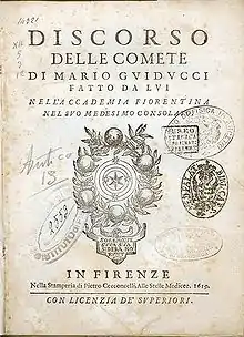 The Discourse on Comets (Discorso delle Comete) was a pamphlet published in 1619 with Mario Guiducci as the named author, though in reality it was mostly the work of Galileo Galilei. In it Galileo conjectured that comets were not physical bodies but atmospheric effects like the aurora borealis.[1]: 62