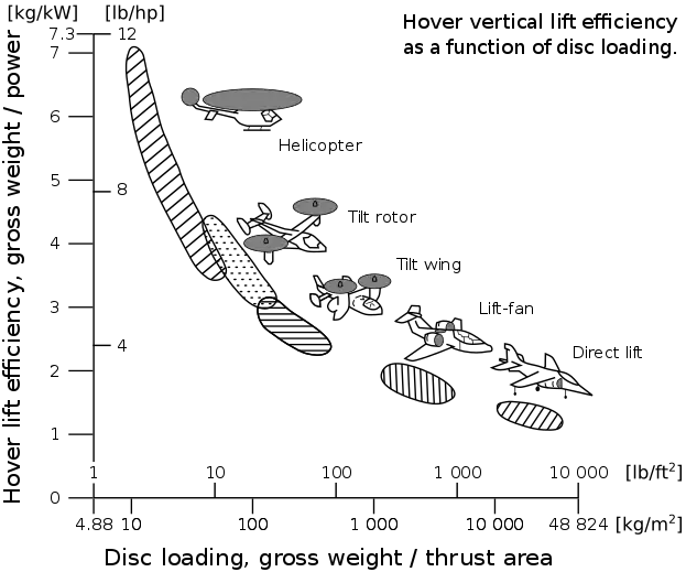 Correlation between disk loading and hover lift efficiency, for various VTOL aircraft