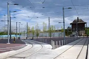 Running on a separated right-of-way, the branch line is approximately 700 metres (0.43 mi) long and has three stops, each with a platform.[1][5] Both streetcar tracks run on the east side of the street, with a tree-lined median separating them from two automobile lanes, and bike lanes on either side of them. The entire width is 32.5 metres (107 ft), including sidewalks 5 metres (16 ft) wide.[5][6]