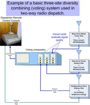 In land-mobile radio, where vehicle-mounted and hand-held radios communicate with a base station radio over a single frequency, space diversity is achieved by having several receivers at different sites. Diversity combining, or voting, in two-way radio systems is a method for improving talk-back range from walkie-talkie and vehicular mobile radios.[5]