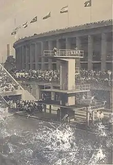 The events are labelled as 3 metre springboard and 10 metre platform by the International Olympic Committee,[2] and appeared on the 1937 Official Report as springboard diving and high diving, respectively.[3] Following the reduction of the springboard events to the 3 metre height, in 1932, the platform events were also reduced to dives from the 10 metre platform, but only for men.[4][5] Meanwhile, women still dived from both 10 and 5 metre heights.[6][7]