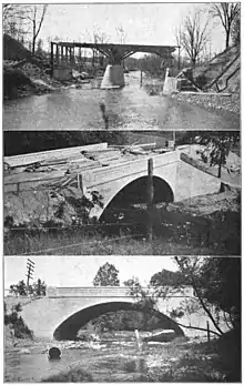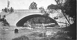 The Division Avenue Bridge was a 50-foot long, 43-foot wide spandrel arch bridge. It had an asphalt-surfaced roadway that with concrete sidewalks on each side. Standard steel rails lined the outside of the bridge. The arch was elliptical, and ended in massive concrete abutments on each end of the bridge. It had a tapered arch ring cast integrally into the plain-faced concrete walls.[3]