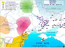 The Dnieper–Donets culture was distributed in the steppe and forest-steppe areas north of the Black Sea. Throughout its existence, rapid population growth and an expansion towards the steppe is noticeable.[6]