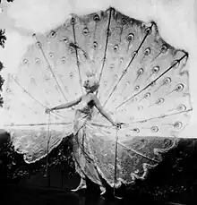 In Midnight Frolic of 1919, Dolores played the part of The White Peacock in the Tropical Birds number. She wore a 10 feet (3.0 m) high peacock costume designed by Pascaud of Paris which Marjorie Farnsworth described as "one of the loveliest costumes ever seen on Broadway".[17] According to one reviewer, a member of the audience asked another, "Is she going to dance?" to which the reply came, "A woman who can stand and walk like that doesn't have to dance."[2] The idea of a peacock costume was not new as Anna Held had worn one in Follow Me in 1916 but it was Dolores who made it her own. Gertrude Hoffmann wore a similar costume in 1920.[18]
