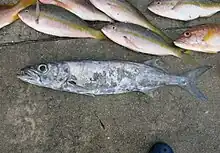 The domine (Epinnula magistralis) is a tropical species of snake mackerel found in all oceans at depths of from 100 to 185 metres (328 to 607 ft).[2] This species can reach a length of 100 centimetres (39 in) SL though most do not exceed 45 centimetres (18 in) SL. While not specifically targeted, this fish is edible and is eaten when caught.