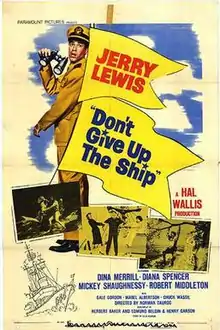 Don't Give Up the Ship is a 1959 American black-and-white U.S. Navy comedy film from Paramount Pictures, produced by Hal B. Wallis, directed by Norman Taurog, that stars Jerry Lewis and co-stars Dina Merrill, Diana Spencer, Claude Akins, Robert Middleton, Gale Gordon, and Mickey Shaughnessy. The film was shot from October 21, 1958 to January 30, 1959 and was released June 16, 1959. The film was based on the Alcoa Theatre episode Souvenir aired on Dec 2, 1957 starring Jack Lemmon that was written by Ellis Arnold Kadison. Kadison's idea was based on Edward Anhalt then serving with the Army Air Force First Motion Picture Unit in Culver City, California signing for a captured German Messerschmidt that was to be used as a prop in a training film. When the aircraft disappeared, Anhalt was issued with a bill from the US Government for $175,000 until a search revealed that the aircraft was discovered as a mockup on the MGM backlot.[5]