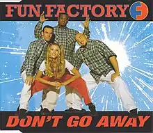 "Don't Go Away" is a song by German Eurodance band Fun Factory, released in April 1996 by various labels as the fourth single from the band's second album, Fun-Tastic (1995). The song is written by Bülent Aris, Toni Cottura and Rodney Hardison, and was a success especially in Spain, peaking at number six.[1] Additionally, it was a top 40 hit in Austria (31) and Germany (37). Outside Europe, "Don't Go Away" reached number 93 on the Billboard Hot 100 chart in the US. Its accompanying music video was directed by V. Hannwacker & M. Rosenmüller, featuring the band performing at a party on the beach.