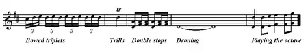 The Donegal style of fiddling is a label often applied to music from this area, though one also might plausibly identify several different, but related, styles within the county.[10] To the extent to which there is one common style in the county, it is characterised by a rapid pace; a tendency to be more un-swung in the playing of the fast dance tune types (reel and jigs); short (non-slurred), aggressive bowing, sparse ornamentation, the use of bowed triplets more often than trills as ornaments, the use of double stops and droning; and the occurrence of "playing the octave", with one player playing the melody and the other playing the melody an octave lower. None of these characteristics are universal, and there is some disagreement as to the extent to which there is a common style at all. In general, however, the style is rather aggressive.[1]