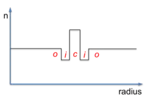 Refractive index profile of double-clad fiber for high power fiber lasers and amplifiers. c:core, i:inner cladding, o:outer cladding.