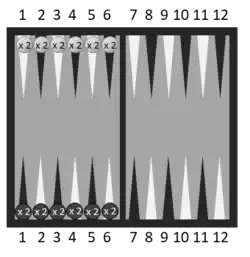 Doblet is one of 15 games recorded in Alfonso X's book of games. It is simpler than English doublets, but uses three dice.[lower-alpha 1][lower-alpha 2] There are two players who only have 12 men each and they place them in pairs on the six points on the table of the board nearest to them. Each pair is stacked, one man being placed on top of the other. The players use the same table of the board, so the pieces are opposite one another. The players roll a die each and the one with the higher cast goes first. Again there are two types of move: first players unstack men based on the numbers they roll i.e. a throw of 1, 3 and 5 entitles a man to be unstacked from each of points 1, 3 and 5. Second, players bear off their men based on the throw of the dice. If a player cannot use a throw, the opponent may utilise it instead and may even win in doing so. The winner is the first to bear off all 12 men.[3]