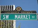 The downtown neighborhood extends west from the Willamette to Interstate 405 and south from Burnside Street to just south of the Portland State University campus (also bounded by I-405), except for a part of northeastern portion north of SW Harvey Milk Street and east of SW 3rd Ave that belongs to the Old Town Chinatown neighborhood.[1] High-density business and residential districts near downtown include the Lloyd District, across the river from the northern part of downtown, and the South Waterfront area, just south of downtown in the South Portland neighborhood.