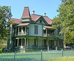 It is a two-and-a-half-story Queen Anne style house. It was expanded by a kitchen/bathroom addition in 1925. A carriage house is an additional contributing building on the property, and it has a cistern on its rear porch and an underground storm shelter.