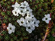 Dracophyllum minimum, commonly known as heath cushionplant or claspleaf heath, is a species of bolster cushion plant endemic to Tasmania, Australia.[1][2] It is a low growing, highly compacted plant with white flowers, commonly found in alpine areas of the south, centre and west of Tasmania.[3]