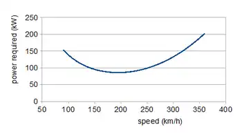 The extra factor of V/η, with η the propeller efficiency, in the second equation enters because PR= (required thrust)×V/η. Power rather than thrust is appropriate for a propeller driven aircraft, since it is roughly independent of speed; jet engines produce constant thrust. Since the weight is constant, the first of these equations determines how CL falls with increasing speed. Putting these CL values into the second equation with CD from the drag curve produces the power curve. The low speed region shows a fall in lift induced drag, through a minimum followed by an increase in profile drag at higher speeds. The minimum power required, at a speed of 195 km/h  (121 mph) is about 86 kW (115 hp); 135 kW (181 hp) is required for a maximum speed of 300 km/h (186 mph). Flight at the power minimum will provide maximum endurance; the speed for greatest range is where the tangent to the power curve passes through the origin, about 240 km/h (150 mph).[6])