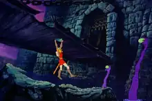 Dragon's Lair is an interactive film LaserDisc video game developed by Advanced Microcomputer Systems and published by Cinematronics in 1983, as the first game in the Dragon's Lair series.[12] In the game, the protagonist Dirk the Daring is a knight attempting to rescue Princess Daphne from the evil dragon Singe who has locked the princess in the foul wizard Mordroc's castle. It featured animation by ex-Disney animator Don Bluth.