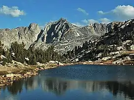 Dragon Peak is a 12,955-foot-elevation (3,949 meter) mountain summit located on the crest of the Sierra Nevada mountain range in northern California.[6] It is situated on the common border of Fresno County with Inyo County, as well as the boundary shared by John Muir Wilderness and Kings Canyon National Park. It is 10 miles (16 km) west of the community of Independence, and 1.3 miles (2.1 km) south of Black Mountain. Dragon Peak ranks as the 161st-highest summit in California.[4] Topographic relief is significant as the north aspect rises 1,900 feet (580 meters) above Dragon Lake in less than one mile. This mountain is habitat for the endangered Sierra Nevada bighorn sheep, which restricts climbing from July through December, so most ascents are made in the spring. The first ascent of the summit was made in 1920 by either Norman Clyde, or Fred Parker and J. E. Rother.[8] The John Muir Trail traverses two miles west of this peak, providing an approach option. The mountain is so named because of the shape of its outline as seen from Rae Lakes.[9]