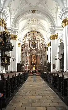 Although the revival of music in churches was a particularly Lutheran initiative, Catholic areas like Vienna and Salzburg were just as keen to promote tower music.[1] Among the most popular of tunes were the Heilig-Leider, paraphrases in German of the Sanctus from the Latin Mass, which came into fashion after the enlightened reforms of the Holy Roman Emperor Joseph I promoted the use of the vernacular in church services.[1] According to one Stadtpfeifer named Hornbock, quoted in Johann Kuhnau's Quack-Salber: "We know from experience that when our city pipers in the festive season play a religious song with nothing but trombones from the tower, then we are greatly moved, and imagine that we hear the angels singing.".[1]