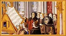 Music written during the Middle Ages for a full range of voices, including treble, mid-range and bass parts, was described by music theoreticians who used the term 'a voce piena ("for full voice" or "full range").[5] As well as writing pieces a voce piena, composers used more restricted ranges throughout the sixteenth century, in all major genres, and for a number of reasons.[5] Various terms were used by writers on music to describe this type of music under headings such as ad aequales, a voci pari, the "grammatically peculiar" a voce paribus, or the related term, a voci mutate.[5]