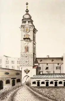 The Stadtpfeifer in Linz at the time was Franz Xaver Glöggl (also Gloeggl), whose full title was Stadtcapell- und Turmmeister (i.e. 'director of city music and tower master').[31] Glöggl had been appointed as Tonkünstler und Musik-Commissioneur in 1789, living at Schmidtor 41. The following year he was Stadt- und Dommusikdirektor und Casininounternehmer ('director of city and cathedral music, and casino manager').[31] He may have been the world's first basset-horn teacher.[37] Glöggl lived in the Schmidtor (de) or Schmiedtor-Turm (Smithgate Tower), provided for the Stadtpfeifer's use by the city: "A narrow staircase led from the street into the tower, where the tower master lived with his fellows."[31]