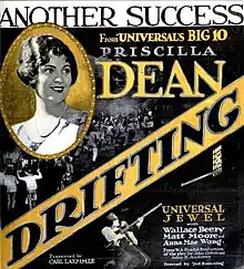 Drifting is a 1923 American silent drama film based on the Broadway play Drifting, by John Colton and Daisy H. Andrews. The play had starred Robert Warwick and Alice Brady. The film was directed by Tod Browning and features Priscilla Dean, Wallace Beery, and Anna May Wong. It was produced and distributed by Universal Pictures.[1]