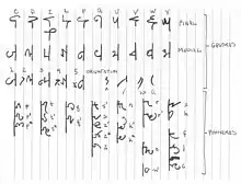 The North Wind and the Sun in Dritok, along with a fairly literal translation, and using a version of the Latin transcription a few years older than that described in the previous section (for example, it joins signs to oral words with >> and ((, one of them perhaps in place of hyphens):[8]