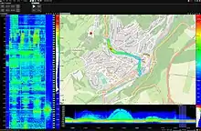 A RF drive test software showing the heat map of a selected frequency/band on a city road