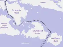 On the east side of Drummond Island, the Canada–United States border passes through the False Detour Channel. On the other side of that channel, the Canadian Cockburn Island separates Drummond from Manitoulin Island.