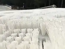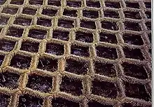 The next stage in dry ski slope development came with the brush industry. The most common material is Dendix[1] which is a by-product of brush manufacturing and is similar to a short-haired brush with the bristles sticking upwards. Dendix is manufactured in Chepstow, however it can be found on slopes throughout the world.[2] It is arranged in a hexagonal pattern of approximately 1-inch (25 mm) strips of bristles in a 4 in (100 mm) hexagon. Although it was a significant advancement from previous surfaces, concern over damage to slope users (it provides little or no impact protection to a slope user when falling) and ski or snowboard damage due to friction meant litigation for slopes using it was a constant threat. Nowadays water is often sprayed onto the surface of the dendix to lubricate it and increase speed; however, higher insurance premiums cause many slope operators to look for safer alternatives.[3]