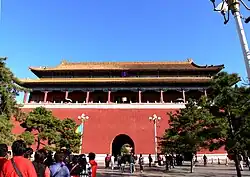Duanmen, also known as the Gate of Uprightness, or Upright Gate, is a gate in Beijing's Imperial City, and is located south of the Forbidden City. Proceeding north from the entrance to the Imperial City, it is the next gate after the Tian'anmen, or Gate of Heavenly Peace, and has a similar structure to that gate. The next gate further north is the Meridian Gate, which is the southern and main gate to the Forbidden City itself.[1]
