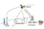 The Antenna and RF subsystem consists of an 11.28 metre antenna system, an S-band transmitter feed, an S-band receiver feed, an X-band receiver feed, and a tracking system. The RF equipment is used to communicate with the satellite. It receives X-band RF signals and performs RF processing. It also produces a demodulated and bit-synchronized data stream from X-band signals. In general, it are to transmit imaging orders and command the satellite through the S-band transmitter feed; receive information and health status from the satellite through the S-band receiver feed; and download the images through the X-band feed.[3]