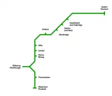 The Dublin-Waterford line is a railway line in Ireland connecting Dublin with the major port of Waterford City in County Waterford. The line is part of the significant network of InterCity routes connected to the Dublin-Cork Main Line from Dublin Heuston. The line was constructed by the Great Southern and Western Railway. At Cherryville Junction, County Kildare the line splits from the Cork line.[1] Both passenger and freight services run on the line. InterCity passenger services are operated by the 22000 Class DMUs. Kilkenny is located on a short spur off the line; freight trains use the Lavistown loop line to avoid reversal there.[2]