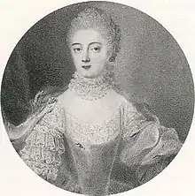 - ↑ Genealogie ascendante jusqu'au quatrieme degre inclusivement de tous les Rois et Princes de maisons souveraines de l'Europe actuellement vivans [Genealogy up to the fourth degree inclusive of all the Kings and Princes of sovereign houses of Europe currently living] (in French). Bourdeaux: Frederic Guillaume Birnstiel. 1768. p. 110.