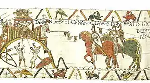 The Duchy of Brittany emerged after Alan Barbetorte's return to the region from England in 936.[22] Barbetorte claimed the titles of the Count of Cornouaille and Nantes and, as Alan II, reigned as the new Brittonum dux.[23] Using a network of small, defended towns and monastic sites, Alan pushed back the Viking advances.[24] On 1 August 939, with the aid of Judicael Berengar, Count of Rennes, and Hugh I, Count of Maine, he defeated the Vikings in the Battle of Trans-la-Forêt, completing their expulsion from Brittany.[25] Alan's duchy was smaller than the previous Kingdom of Brittany, as, despite gaining Magues and Tiffauges in the south, the dukes no longer ruled over the regions of Cotentin, Avranchin, and Mayenne.[23] Alan paid homage to Louis IV of France for Brittany in 942.[26] Despite some older Celtic influences, the new duchy was in many ways similar to the other, post-Carolingian states forming across the region.[7] Over the coming decades, a network of powerful local lords emerged across Brittany, occupying motte and bailey castles and owing a loose feudal loyalty to the duke.[27] The east of Brittany was the first to change, but the practices spread over the next fifty years to the more remote regions of the north- and south-west.[28]