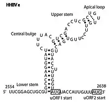 DHBV epsilon consists of a stem structure, a bulge and an apical loop (Fig. 1). The RNA structure was determined by chemical probing, NMR analysis and by mutagenesis.[3]