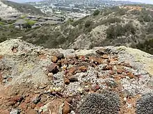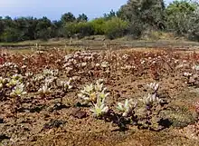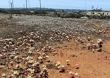 The plant was also known to grade into Dudleya variegata abundantly at a vernal pool-like depression north of Eastgate Mall road and west of the I-805 near Miramar and the Sorrento Valley.[10][11][3] The location is now an office park.[12] The hybrids possessed intermediate traits.[11][13]