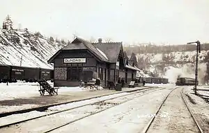 The Great Western Railway (GWR) put their line through Dundas in 1853, but it wasn't until 1864 that the first station was built.[3] They algamated with the Grand Trunk Railway (GTR) in 1882,[4] who constructed a new station building in 1904 and double tracked the line.[3] The GTR was absorbed by the Canadian National Railway (CNR) in 1923. Via Rail continued to provide passenger train service to the station from 1977 until the mid 1980s. A fire seriously damaged the station in 1984 and it was decided to move the historic structure to a more suitable site. The building collapsed while it was being dismantled and it could not be saved.[3] The VIA/Amtrak International continued to stop until it was rerouted in 1990. A restricted fire access route from Highway 8 is the only reminder of a railway station in the area.