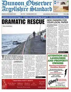The Dunoon Observer and Argyllshire Standard is a weekly tabloid newspaper serving the Cowal Peninsula area of Argyll and Bute, in western Scotland. It is edited and printed in Dunoon, and is known locally as the Standard. The newspaper is owned by Argyll Media Ltd. It was published by E&R Inglis Ltd. until 2015, when the owners, Marion and John Carmichael, decided to retire.[3] It had been in the Inglis family for 144 years.