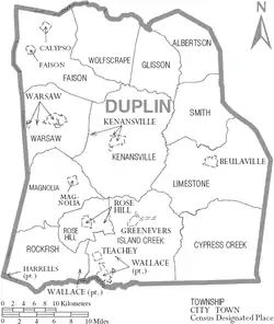Map of Duplin County with municipal and township labels