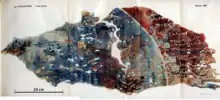 The Belgian archaeologist Franz Cumont discovered the map fragment during excavations in Dura-Europos in 1923[3] in the submerged "Tower of the Archers".[4] The map is a fragment of leather or parchment, painted in colour, which had been found among the remnants of wooden oval shields. It was identified by Cumont as the remains of the leather cover of a laminated shield with remnants of the wooden parts of the shield still attached to the back. The map had been made by a Roman soldier, probably an infantryman or an archer of the Cohors XX Palmyrenorum, an auxiliary cohort stationed in Dura. This soldier drew the travel stages of his unit on the march through the Crimean on the leather cover of his shield somewhere between AD 230 and AD 235. Geographical inconsistencies may point towards the owner of the shield having commissioned somebody else with the drawing.